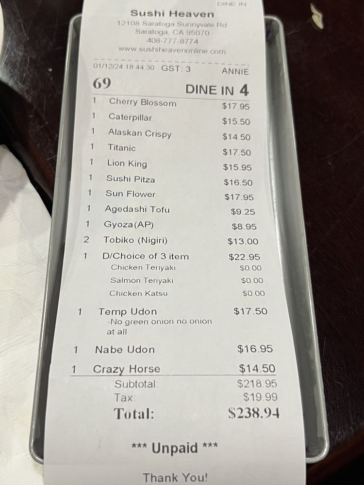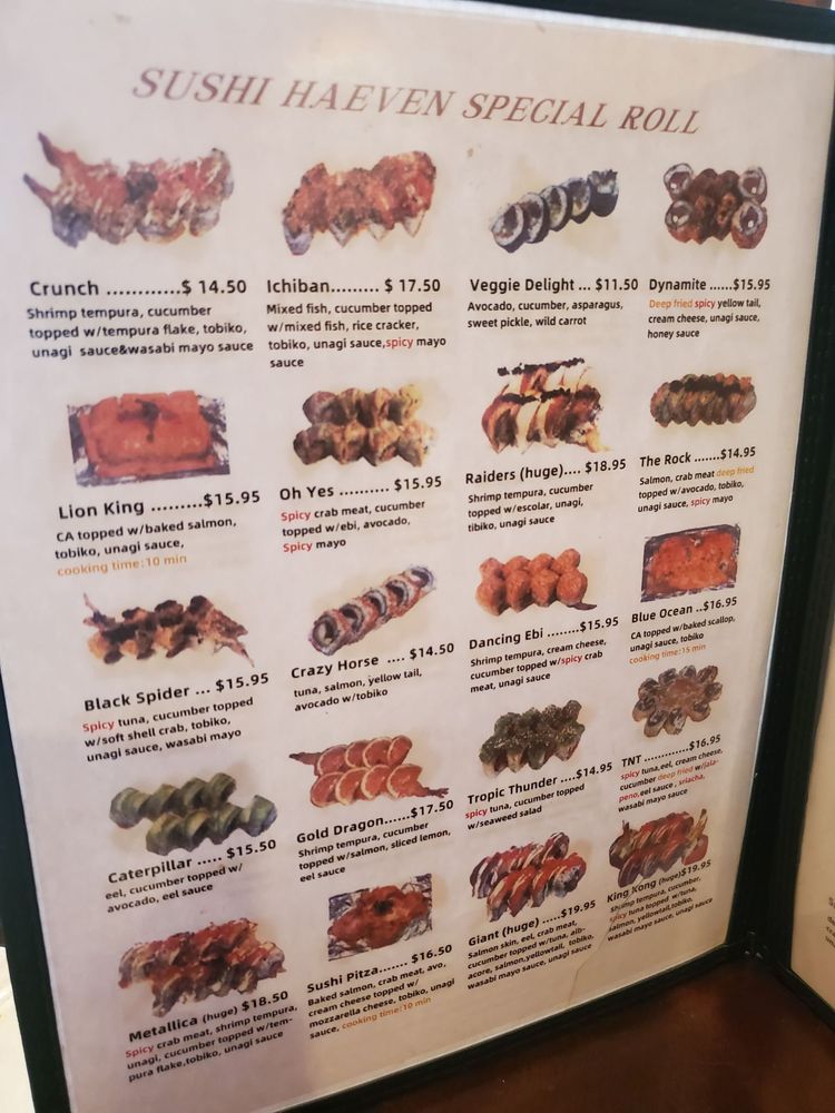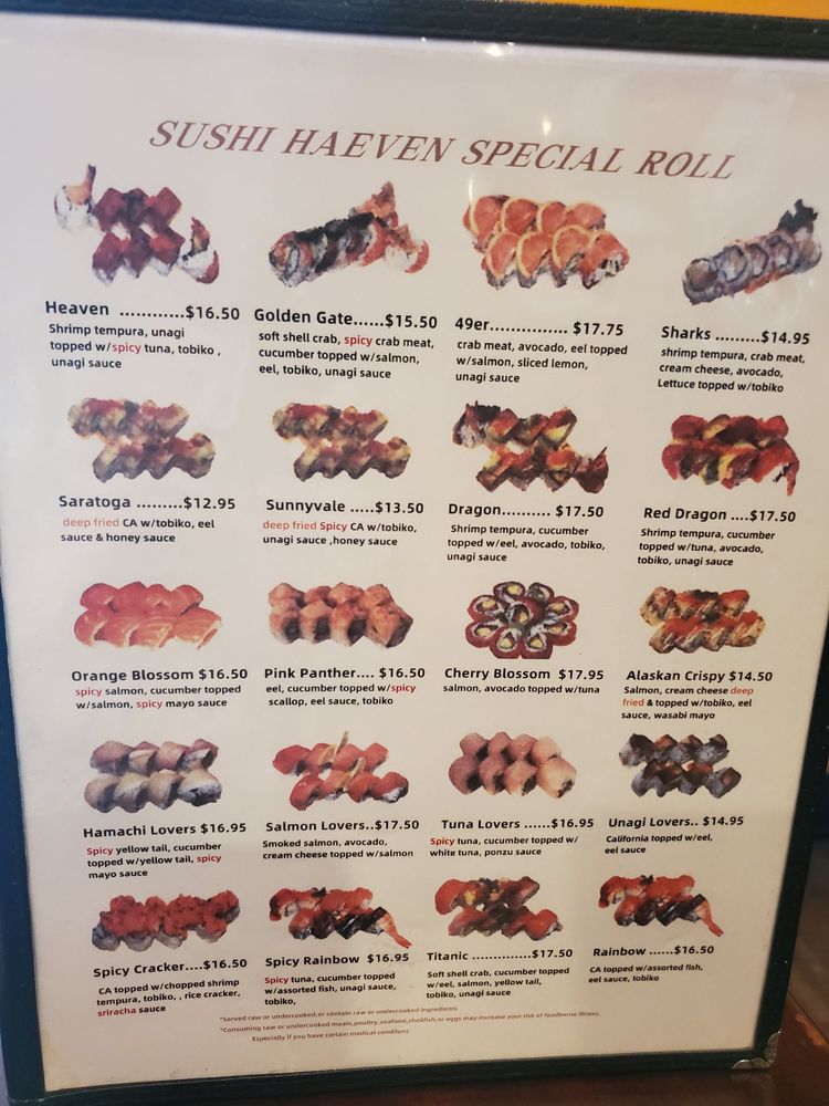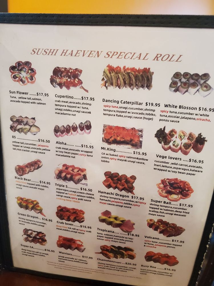 Sushi Heaven in Saratoga, CA offers a diverse menu of sushi and Japanese cuisine. Customers praise the quality of the sashimi and dinner combos, highlighting the fresh fish and reasonable prices. The atmosphere is described as inviting and the service is fast and attentive. The restaurant offers a variety of seating options, including outdoor and drive-thru. Many reviewers recommend trying the Crunch Roll and Saratoga Roll for flavorful and crispy options. The chirashi bowl and giant rolls are also popular choices. While some note a slight price increase, the generous portions and quality of the food make it worth a visit. Overall, Sushi Heaven is a solid choice for satisfying sushi cravings in a casual setting with a range of options for both individuals and groups.